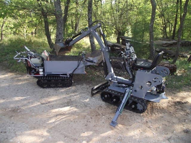 Seeing more possibilities, he bought another trackbarrow and, using its chassis, built an hydraulic bucket arm to turn it into a very neat mini-digger. The remarkable thing about this small excavator is that although it has ‘dual fuel’ (electric and petrol (gas)) – it is designed to run on Sunlight alone.