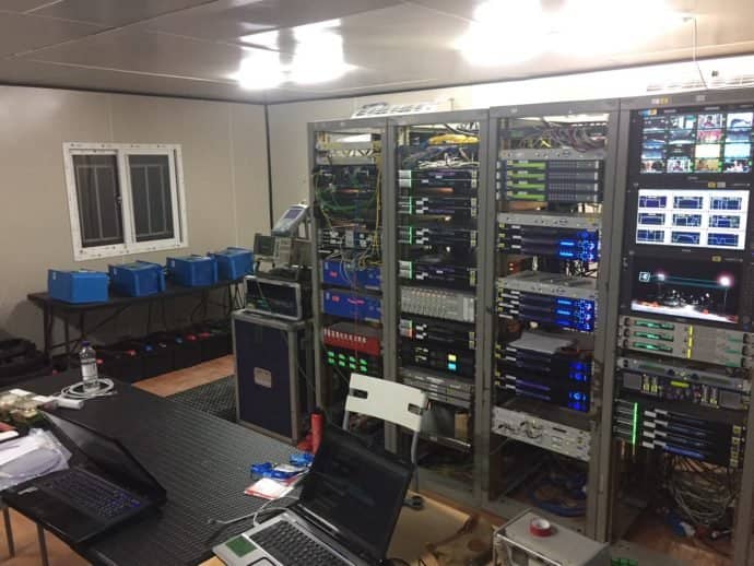 Multi-Link Holland – is a Dutch company which has been providing satellite up-link communications for reportage and sporting events to Broadcast Networks for almost 20 years. Marco van Uffelen, one of Multi-Links engineers, says that the key to success is portability and an ethos that no problem is insurmountable. Their equipment is ready to go at a moment’s notice by road, air or sea – and when you think about the hurdles to providing remote outdoor broadcast, from anywhere – you can see why experience counts.Interestingly, one of the first things they do – having arrived in the country of deployment with a cargo of technical wizardry – is to buy some truck-batteries! Too heavy to lug half-way around the world, lead/acid batteries are available anywhere and work reliably and predictably. Even when grid electricity is available, you must be prepared for the possibility of it failing – hence the provision of an ultra-reliable uninterrupted power supply for the dazzling array of satellite amplifiers, audio/visual monitors, satellite modulators and switching gear – as seen above …secured by 8 x Victron Multiplus 24V units which will guarantee an Uninterruptible Power Supply.