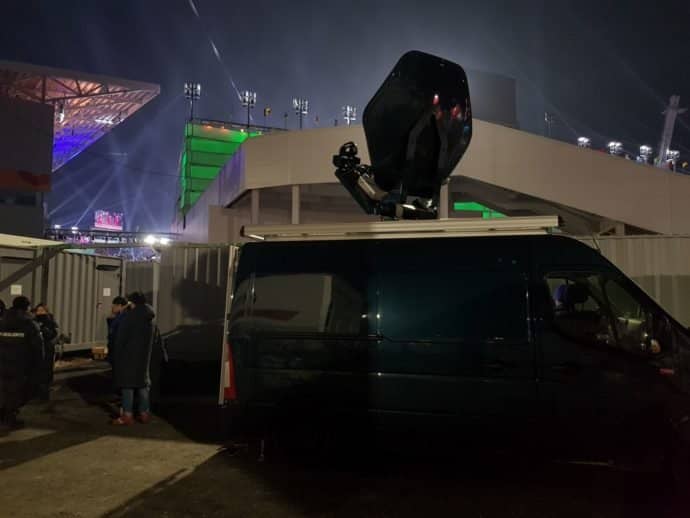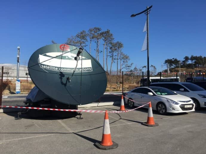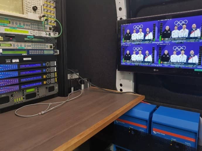 This huge 3.7m ‘Flyaway’ Antenna can be loaded as air freight. Installed near the Gangneung Oval – where the Speedskating has been taking place – the antenna has high-power satellite amplifiers backed up by a 5kVA Multiplus Quattro with two 250Ah Truck Batteries. You can probably catch a glimpse of the ‘tents’ which have been installed over the amplifiers to protect them from the snow.