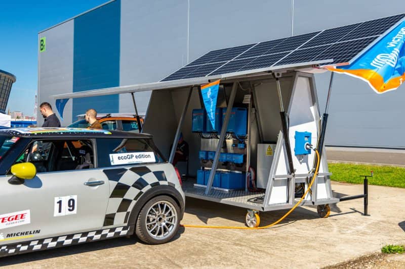 The eco Grand Prix heralds a new era of sustainable Grand Prix racing. As such, having a recharge station with a generator banging away in the background doesn’t quite fit the bill – so a prototype solar powered recharge station with Lithium battery storage was designed by Eastern European sales manager Lucian Popescu, and built by the well-known and successful distributors Darcomenergy and EcoAlternativ.