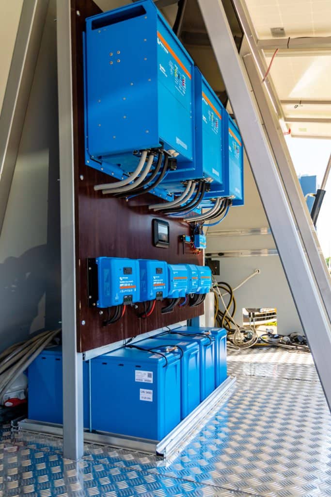 It featured an hydraulically operated solar panel array allowing the 12 x 370W panel arrays to be dropped for easy transport – and opened allowing the panels to be optimally-tilted toward the sun when in use. Two SmartSolar MPPT 250/60 units harvest energy for storage in 4 Lithium 25.6V Smart batteries. Three-Phase recharge with a 22kW power capability was supplied by 3 Quattro 10000 Inverter Chargers.