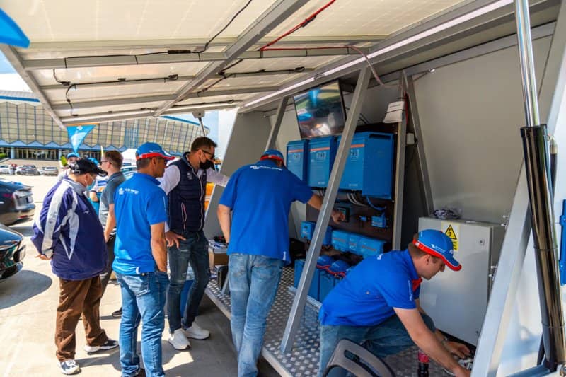 Victron Energy achieved not one but TWO two glamorous milestones at the event – not only did our sponsored vehicle win; but we showcased our prototype Mobile Electric Vehicle Charging Station …without which the event could scarcely have gone ahead!