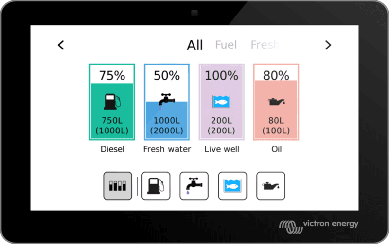 Tank levels readings are generated by locally-connected Victron communication device (eg. Cerbo GX); on a Multi Function Display; or read it from anywhere in the world using the Victron Remote Management portal.