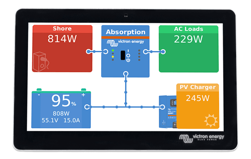 One-cable connection to a Victron Communication device (eg Cerbo GX) provides seven-inch, touch-screen, whole-system command and control. Stylish, slim, waterproof.