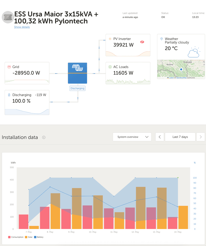 Data communication between all cross-manufacture devices is enabled by a Cerbo GX which also uploads real time data to Victron Energy’s free-to-use remote management platform VRM. VRM provides engineering access to the system so that its behaviour can be observed, and settings can be modified and tweaked remotely.