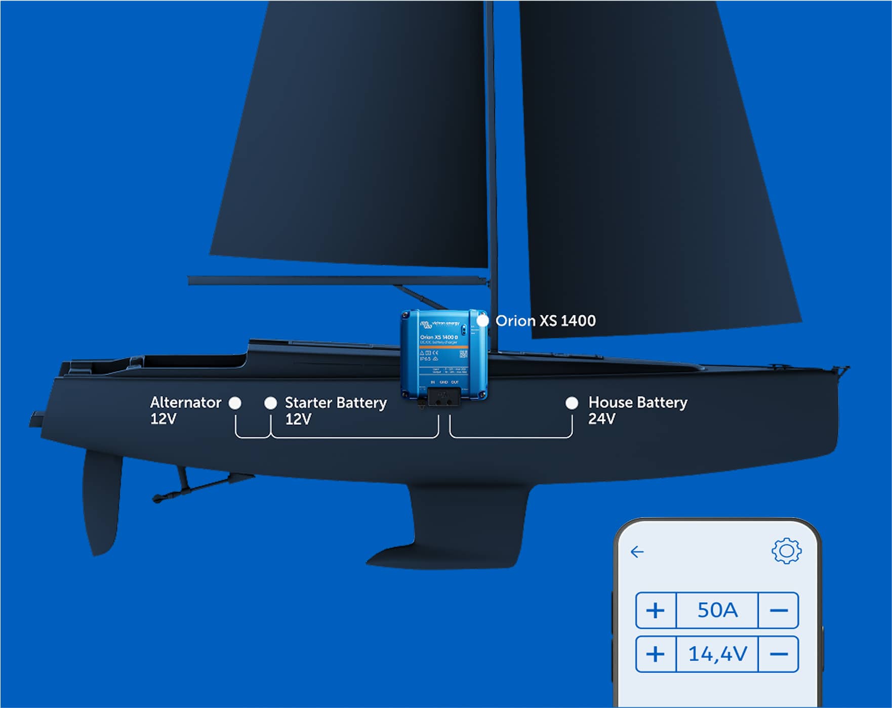 Input current can be precisely limited to prevent alternator overload. Charging voltage is fully configurable to match lithium, AGM, Gel, and other battery chemistries. For mixed-voltage systems, the Orion XS 1400 also provides 12V to 24V or 24V to 12V conversion.
