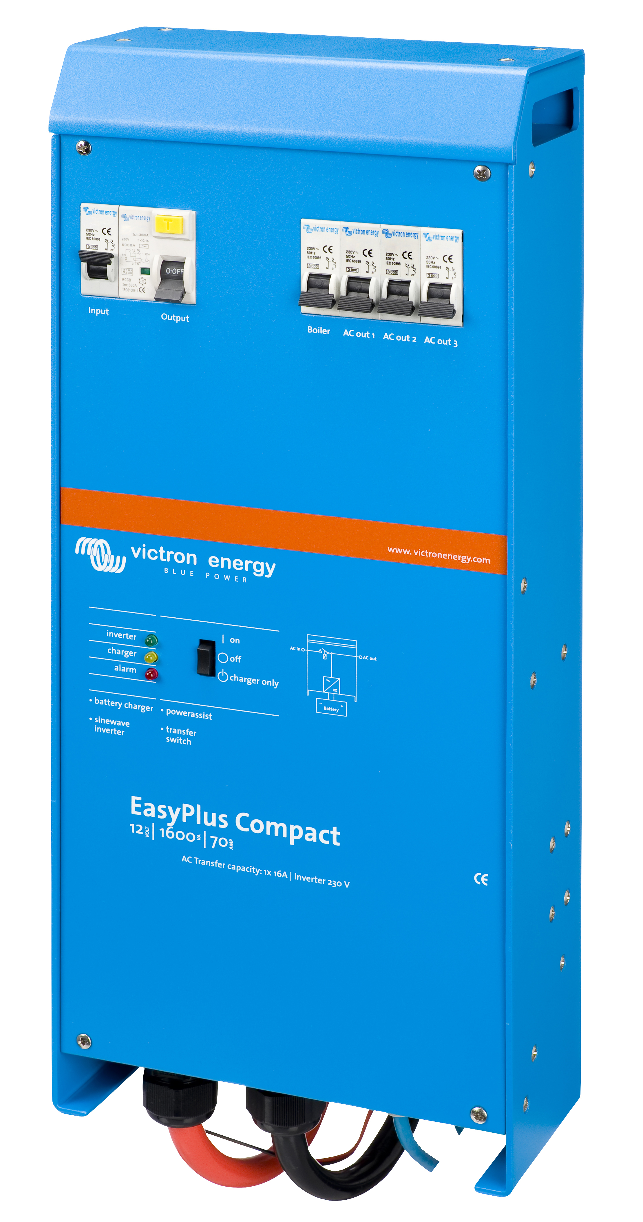 EasyPlus er et multifunksjonelt energisystem som består av en kraftfull sinuskurve omformer, en avansert batterilader, en høyhastighets AC overføringsbryter og AC fordeling i en enkel, kompakt kabinett med lav vekt. Systemet har blitt designet av de som ønsker å nyte bekvemmeligheten og friheten av et komplett energisystem uten å bruke tid på installering av enkeltstående elementer og teknisk vanskelige prosedyrer.